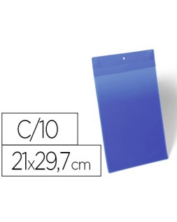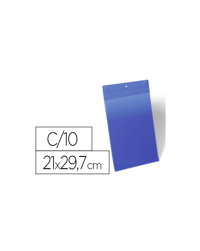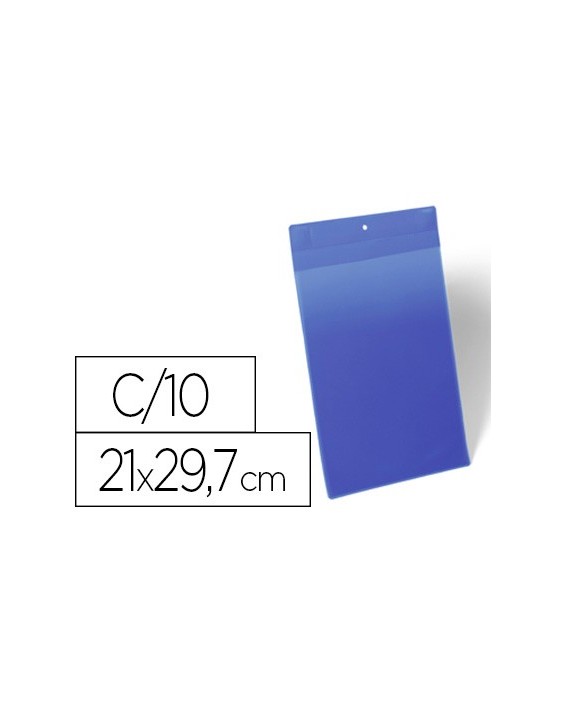 Funda magnética. Fuerte sujeción a superficies metálicas como contenedores y tuberías gracias a los dos imanes Neodym con fijación térmica. Plástico azul en la parte posterior y ventanilla transparente de polipropileno resistente. Admite lectores tipo escáner y resistentes al desgarro. Fácil intercambio de etiquetas. Apta para uso exterior gracias a la solapa que protege los documentos del polvo y la humedad. Color azul. Medidas: 210 x 297 mm. El paquete de 10 unidades.