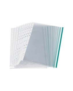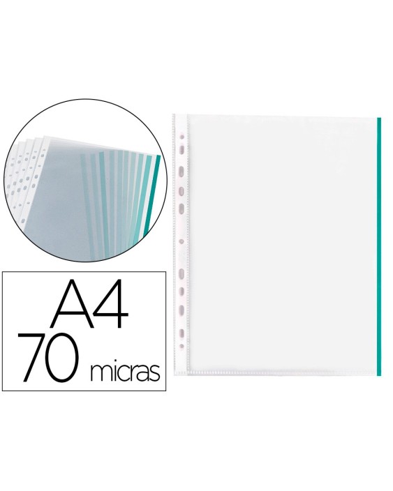 Funda para la protección y archivo de documentos. Con borde de color que ayuda a clasificar y distinguir la información. Fabricada en polipropileno cristal liso. 8 taladros. Grosor: 70 micras. Colores: amarillo, azul, negro, rojo y verde. Formato DIN A4. La bolsa de 10 unidades.