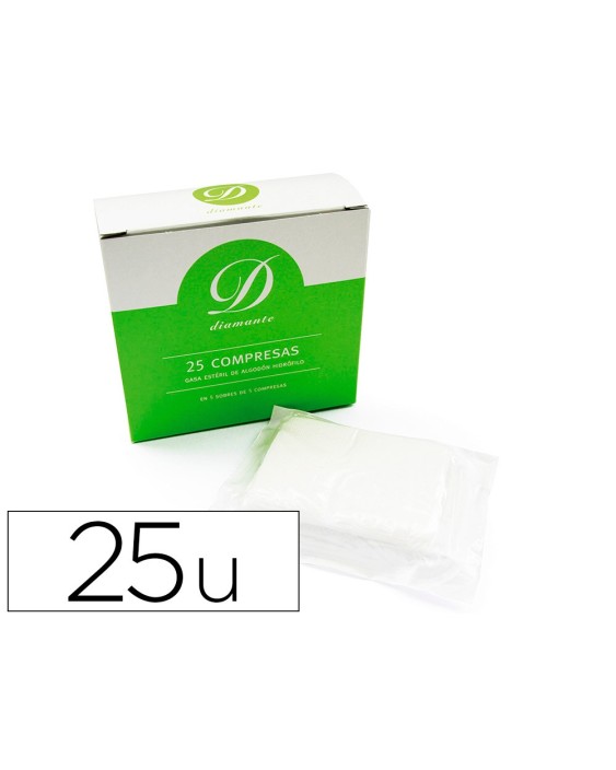 APÓSITO ESTERIL DE ALGODÓN HIDRÓFILO. UTILIZADAS EN PRIMEROS AUXILIOS. ESTÁN LIBRES DE GÉRMENES Y NO SE DESPRENDEN FLAMENTOS EN LA EXTENSION DE LA PIEL DONDE SE TRATA. PERMITE EVITAR INFECCIONES EN HERIDAS ABIERTAS, IMPIDIENDO QUE AGENTES PATÓGENOS PASEN A TRAVES DE LOS VENDAJES. OTRAS DE SUS FUNCIONES SON COMPRIMIR LA ZONA A TRATAR, ABSORBEN LO QUE EXUDE INMOVILIZAN O LIMPIAN HERIDAS. CAJA DE 25 UNIDADES