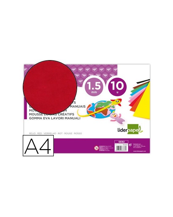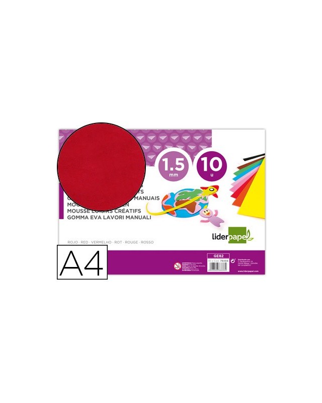 Goma eva liderpapel din a4 60g/m2 espesor 1,5mm rojo paquete de 10 hojas