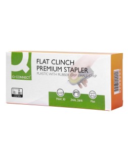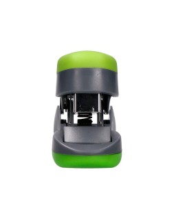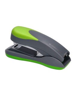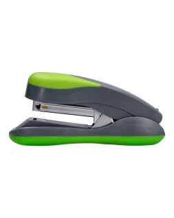 Grapadora de plástico verde y gris con mecanismo metálico. Usa grapas de 22/6, 24/6 y 26/6. Longitud del grapado al borde de la hoja: 55 mm. Carga 3 peines (150 grapas). Grapado cerrado plano. Superficie verde de caucho antideslizante. Longitud de la base: 147 mm. Medidas: 43 x 68 x 147 mm.