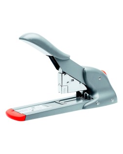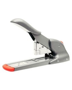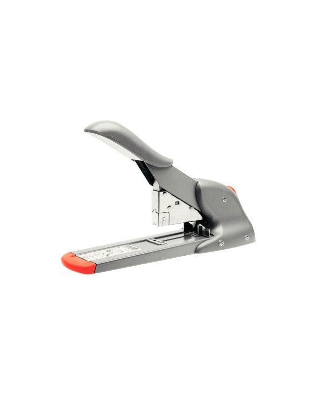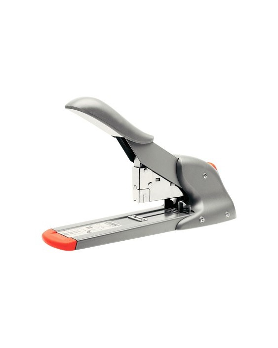 Robusta grapadora de carga frontal, con mecanismo de palanca para una gran capacidad de grapado. Ideal para servicios postales y oficinas. Capacidad de grapado de 110 hojas. Utiliza grapas 23/8-15 y 9/8-14. Profundidad de grapado: 66 mm. Color plata/naranja. Medidas: 100 x 154 x 325 mm.