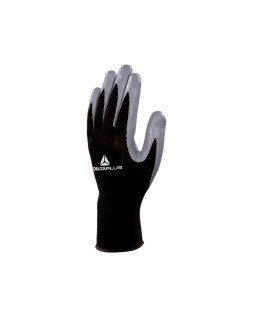 Guante de tejido de punto 100% poliéster. Sin costuras. Impregnación de nitrilo en la palma y las puntas de los dedos (dorso fresco). Puño elástico. Muy buena resistencia a la abrasión, a los aceites y a las grasas. Color negro/gris. HOMOLOGADO EN NORMA EN388: 3121X Y ISO 18889:GR.