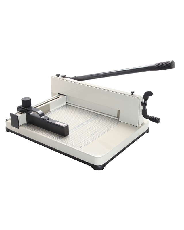 Guillotina manual profesional con capacidad para 400 hojas. Longitud del corte: 330 mm. Espesor de corte: 40 mm. Base metálica graduada. Con diferentes sistemas de protección: el cortador tiene un bloqueo de seguridad, además, la cuchilla está cubierta por una caja de seguridad para evitar cortes. Medidas: 600 x 435 x 250 mm.