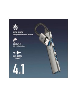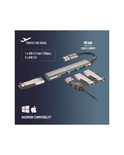 Amplía la conectividad de tu ordenador con el Hub USB de 4 puertos. Un accesorio compacto, elegante y ligero, perfecto para tu escritorio. Expansiónsencilla y eficiente. Incorpora 4 puertos USB para conectar múltiples dis positivos sin esfuerzo: 1 puerto USB 3.2 Gen1 con una velocidad de transferencia de hasta 5 Gbps y 3 puertos USB 2.0 para mayor versatilidad. Alta velocidad de transferencia. Ideal para mover archivos de forma rápida y eficiente, optimizando tu productividad. Diseño compacto y portátil. Su tamaño reducido y ligereza extraordinaria lo hacen perfecto para llevarlo a cualquier lugar. Además, cuenta con un cable de 100 mm para mayor comodidad. Compatibilidad universal. Compatible con USB 1.1, USB 2.0 y USB 3.2 Gen1, además de ser totalmente funcional con PC y Mac si