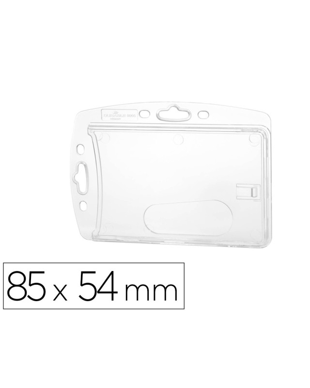 Identificador en diseño cerrado para una tarjeta de identificación de empresa/acreditación de seguridad. Material transparente para óptima legibilidad y fácil escaneado de códigos de barras. Con uñero para fácil extracciónde la tarjeta. También se puede combinar con clip, yoyó, cadena o cinta t extil. El identificador se puede usar en formato vertical y horizontal. Medidas interiores: 54 x 87 mm.