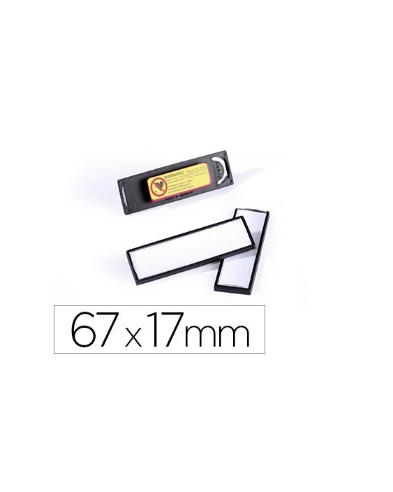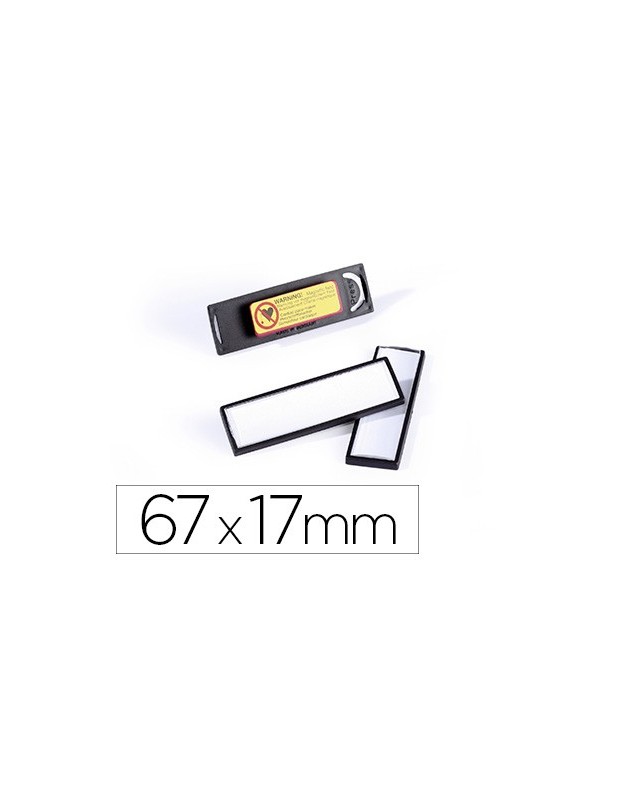 Portanombres con marco de color y resistente ventanilla de plástico antiarañazos. Práctico mecanismo de clip para un fácil y rápido cambio de etiqueta. Sujeción segura mediante imán doble que no daña ningún tejido, ni siquiera los más delicados. Ventanilla convexa acrílica con efecto de lupa. No recomendado para personas con marcapasos. Medidas: 67 x 17 mm. Color: negro.