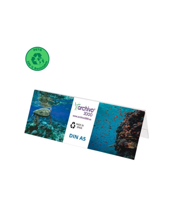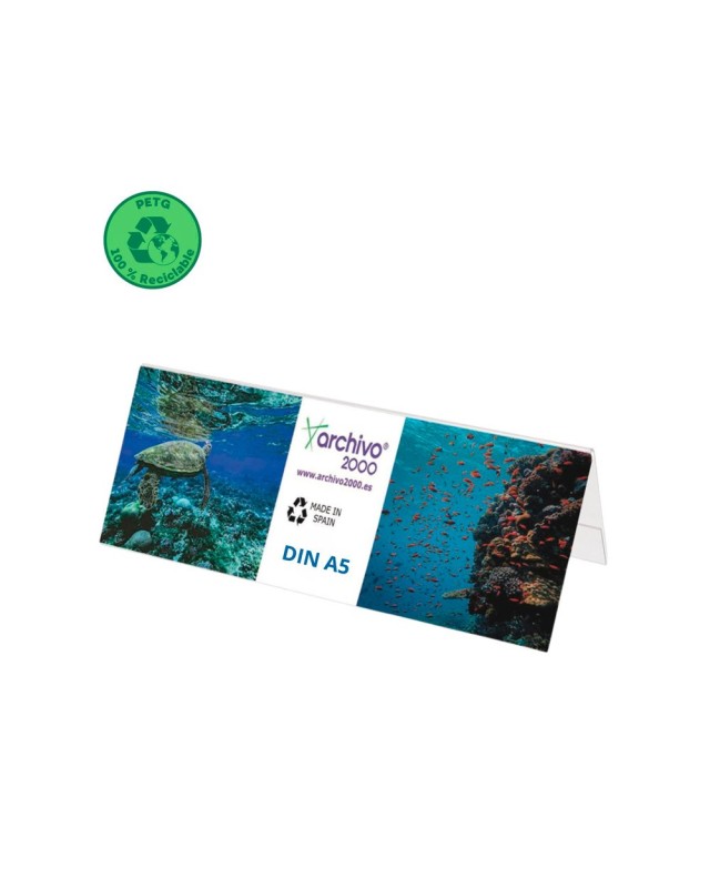 Portanombres de sobremesa flexibles Archivo 2000 formato ancho DIN A5. Fabricados en PET, libre de PVC. 100% reciclable. Alta resistencia a impacto,desgaste o rotura. Visibilidad por ambas caras. Color cristal transparent e. Medidas exteriores: 60x210x75 mm. Fabricados en España.