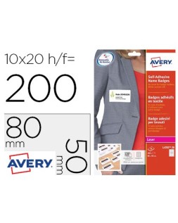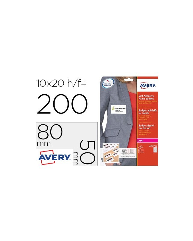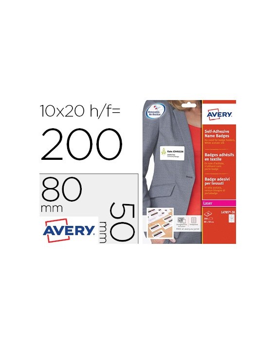 Identificativos en acetato de seda personalizables y imprimibles con impresora láser. Ideales para seminarios, eventos y mítines. Adhieren perfectamente al traje y se remueven fácilmente sin dejar residuos o dañarla ropa. Se pueden dejar con el suporte. Caja de 20 hojas. Se puede utilizar el software crea e imprime gratuito de Avery para realizar el diseño de las etiquetas con pocos clics.