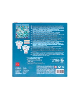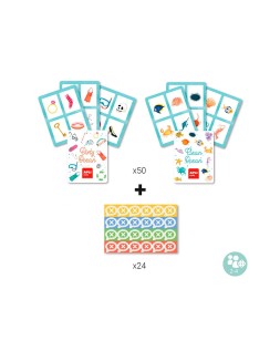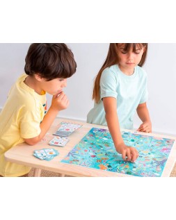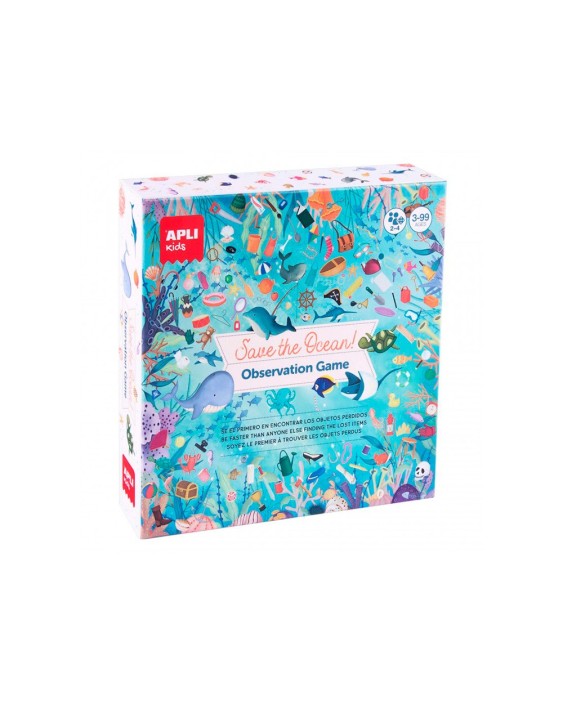 Juego de observación y velocidad Salvar el Océano. Los jugadores tendrán que encontrar lo más rápido posible las 4 imágenes de su carta en el tablero para ganar. El juego incluye cartas con imágenes de objetos que representan la basura que podemos encontrar en el océano y también los animales y plantas que viven bajo el agua, por lo que los niños a la vez que juegan aprenderán a sensibilizarse sobre el medio ambiente. El juego incluye: 1 tablero de 40 x 40 cm. 50 cartas con imágenes de 6,5 x 8,5 cm. 24 stickers reutilizables. 1 hoja de instrucciones. ¡Se el primero en encontrar los obj