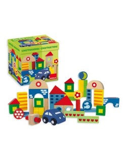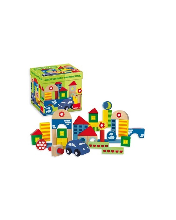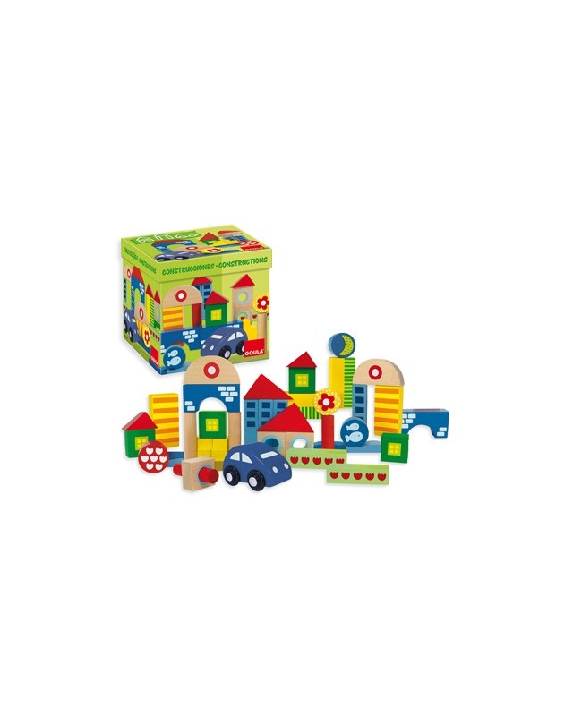 Juego de 41 piezas de arquitectura de madera serigrafiadas por las dos caras. Incluye un coche con ruedas. Formas originales y colores muy vivos. Incluye envase de cartón para guardar las piezas. A partir de 1 año. 1 o más jugadores. Medidas: 19 x 18,5 x 18,5 cm.