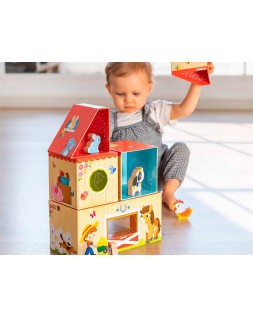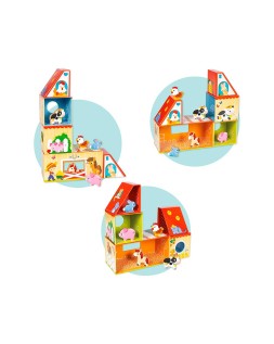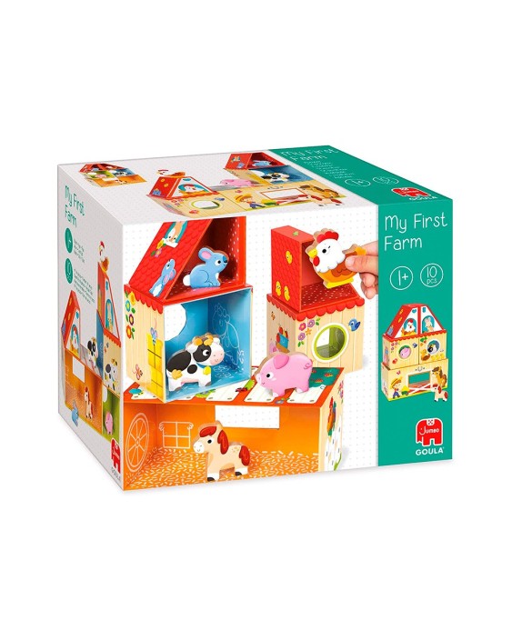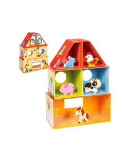 Juego para la primera infancia que consiste en construir una granja apilando las piezas de diferentes maneras. Hay 5 animales de manera (gallina, vaca, caballo, cerdito, conejo) para poder jugar una vez la granja esté construida. Existen muchas combinaciones para formar diferentes granjas. El juego está ilustrado por dentro y por fuera y todas las piezas se pueden guardar dentro de la pieza más grande.