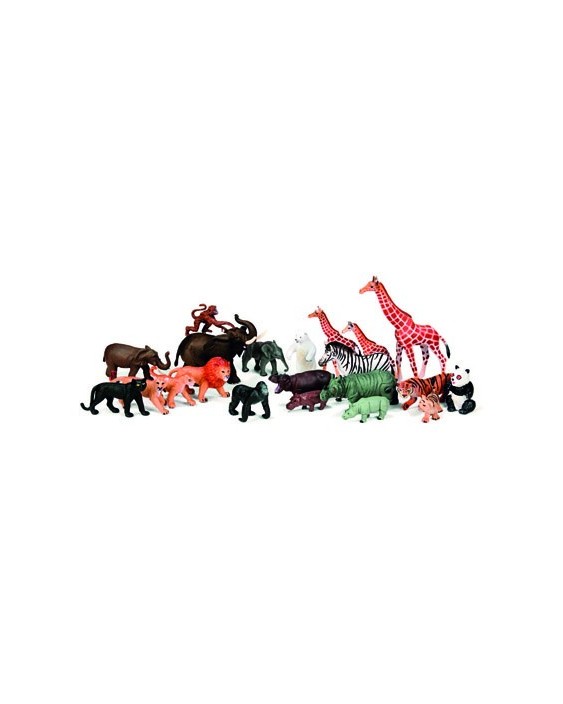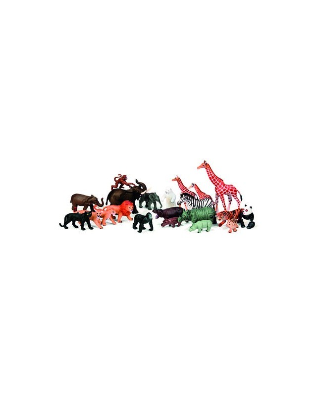 Contenido: león, leona, oso panda, oso polar, jirafa, elefante, pantera, tigre, rinoceronte, hipopótamo, mono, caballo, gorila, lobo, cebra, burro, cabra, oveja, oso pardo, vaca, toro, perro, cerdo, cerda, oca, conejo, gallo, gallina, pavo común, gato y 1 guía didáctica.