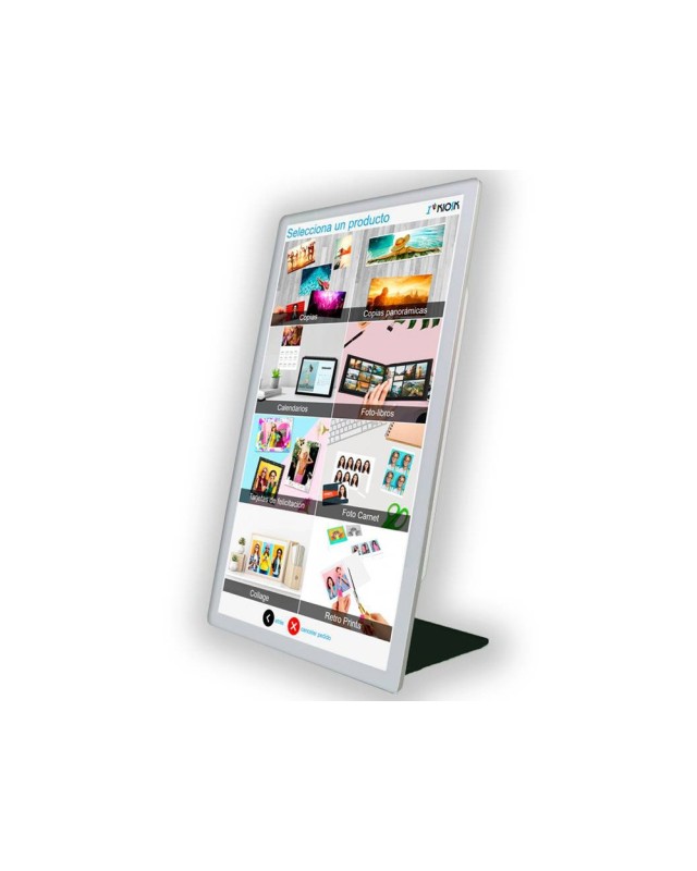 Quiosco fotográfico Citizen con pantalla de 23,8 pulgadas, plataforma offline y múltiples opciones de conexión para impresión directa desde dispositivos o redes. Incluye software creativo para imprimir fotos, carnés, collages, calendarios y más, con posibilidad de diseño personalizado. Compatible con impresoras Citizen y equipado con un cable 3 en 1 y salvapantalla personalizable.