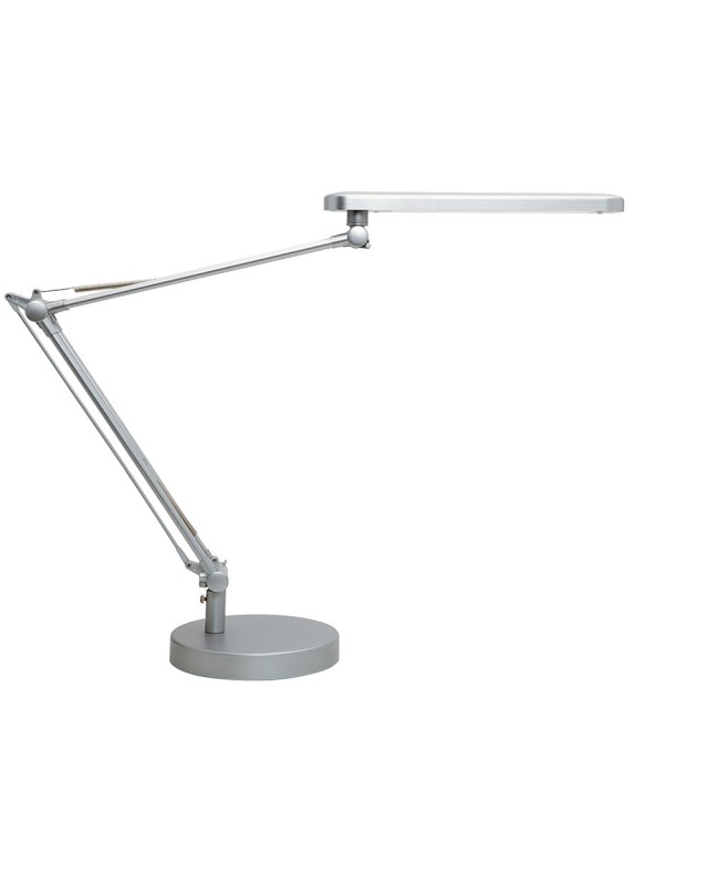 Equipada con led integrado de 5,6W de potencia con una duración de 40 años y 460 lúmenes. Lámpara de oficina con buena eficiencia luminosa: 109 lm/ W. Consume dos veces menos que una lámpara fluorescente. Equipada con un difusor que permite un mejor reparto de la luz. Su brazo tiene 3 articulaciones. Gira 360 sobre la base y el cabezal gira en todas direcciones. Consumo energético 4,2 kW cada 1000 horas. El interruptor está en el cabezal. Medidas: 190 x 580 + 460 x 290 mm.