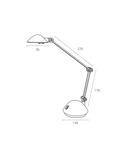 Lámpara LED fabricada en ABS y metal. Acabado mate de gran calidad. Altura regulable gracias a su brazo articulado doble. Potencia: 3W - 230V. Flujo luminoso: 200 lumen. Temperatura de color: 3000 K (blanco cálido). Tiempo de vida estimado: 30 000 h. Medidas: 130 x 170 + 270 mm x 130 mm.