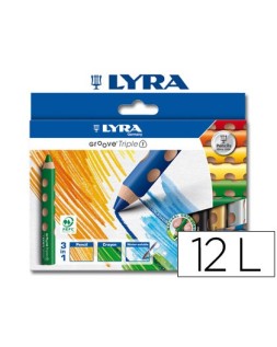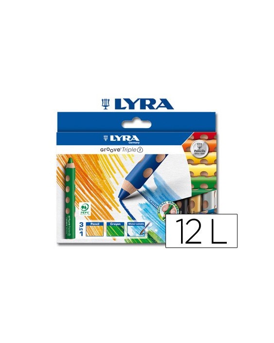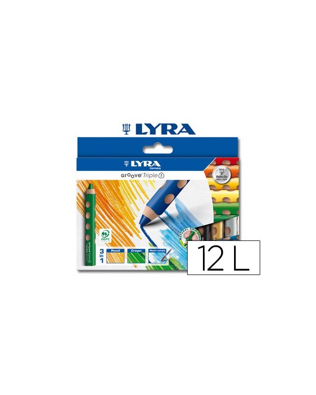 Lápices de colores acuarelables. Lápices 3 en 1, son lápiz, cera y son acuarelables. Lápiz ergonómico triangular y soluble en agua. Ergonómico gracias a sus hendiduras. Zona de grip natural sin materiales añadidos. Caja de cartón de 12 colores. Altura de lápiz: 120 mm. Diámetro de lápiz: 15 mm. Diámetro de la mina: 10 mm.