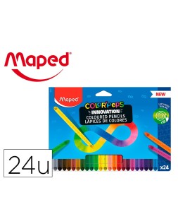 Caja de 24 lápices de colores innovadores que duran 10 veces más. Lápiz 100% mina, 100% utilizable, 0 residuos, cumple con la normativa de los juguetes. No hace falta afilarlos, se van afinando solos al colorear. Ergonomía: lápiz triangular para mejorar la sujeción. Diseño original y patentado que permite al niño colorear por los 2 lados.