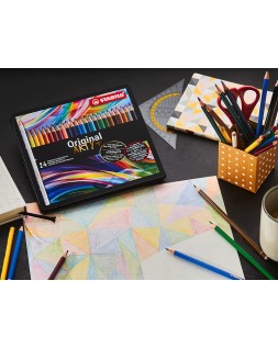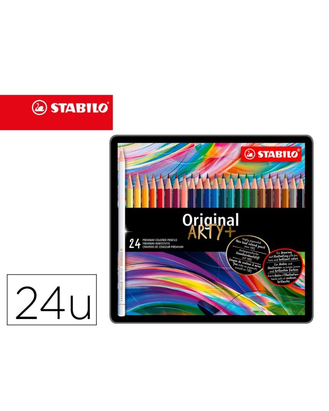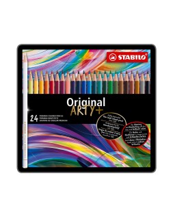 Estuche de metal Arty + con 24 lápices de color para dibujo de precisión StabiloOriginal. Mina fina y muy elástica extremadamente resistente al mismo tiempo. Para líneas finas y limpias. Convertible en acuarela parcialmente: los conternos siguen siendo visibles. Alta resistencia a la luz y brillo. Apto para fotocopiar. Diámetro de mina 2,5 mm.