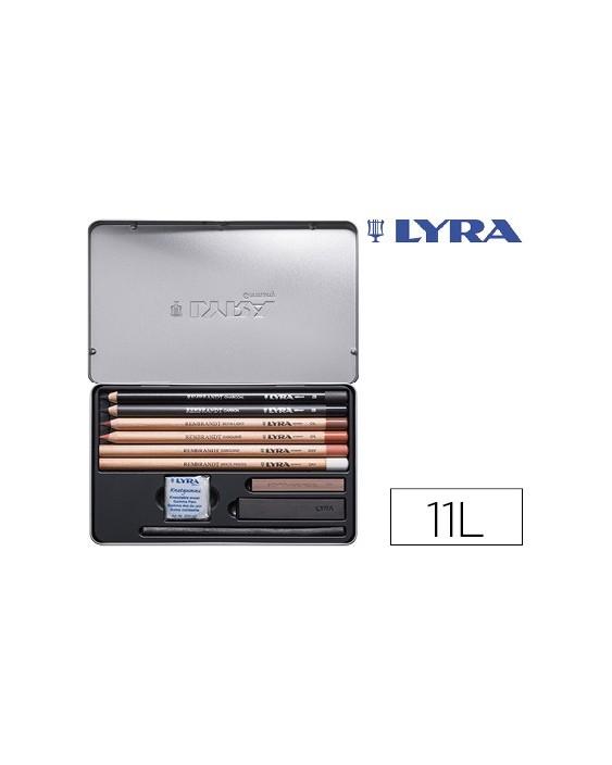 Caja metálica que contiene: 1 lápiz carboncillo 2B, 1 lápiz carbón 2B, 1 lápiz sepia claro OIL, 1 lápiz sanguina OIL, 1 lápiz sanguina DRY, 1 lápiz blanco DRY, 1 pastel cuadrado Sepia 8 x 8 mm, 1 pastel cuadrado Carbón extra dark 2B 7 x 14 mm, 1 carboncillo de evónimo 6 mm, 1 goma moldeable y 1 sacapuntas.