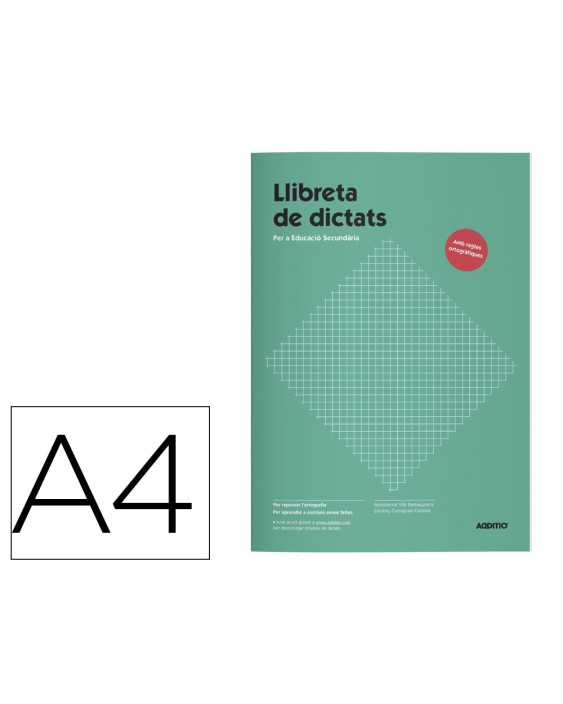Material innovador para aprender y repasar ortografía. Con acceso gratuitoa www.additio.com para descargar dictados modelo. CONTENIDO: recomendacio nes para hacer un buen dictado, páginas de dictados y de reflexión ortográfica, compendio de reglas de ortografía. FORMATO: tamaño 17x24 cm., 64 páginas, cubiertas en estucado plastificado, papel ecológico. Catalán.