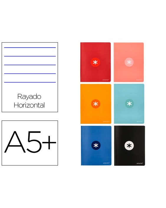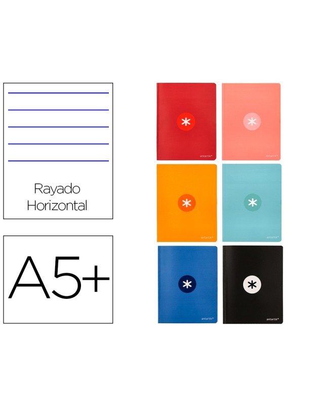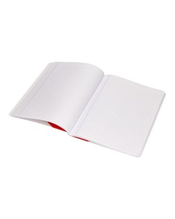 Libreta cosida con tapa de papel estucado impreso de 350 g/m² y plastificado en polietileno mate antiroce con reserva brillo. Formato Din A5+. 48 hojas. Papel extrablanco de 90 g/m² ultrasuave, hace la escritura mucha más fluida. La tinta no traspasa. Horizontal. Con margen. Colores surtidos.