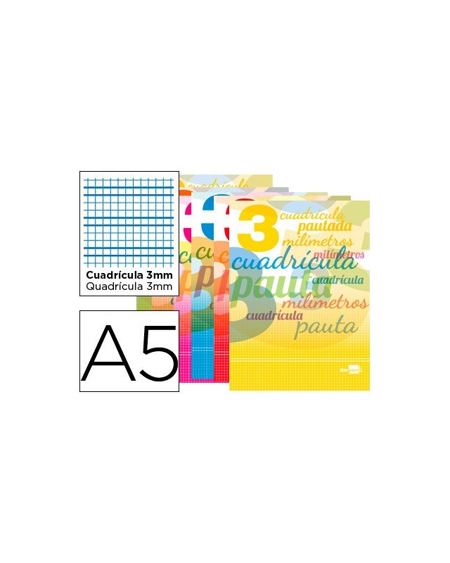 Tapa y contratapa de cartoncillo impreso plastificado brillo. 32 hojas. 70 g/m². Incluye una cuadrícula pautada en su interior que sirve de guía al alumno en el aprendizaje de la escritura. Hueco para añadir los datos personales en la tapa sobre una cuadrícula del mismo tamaño a la impresa en el interior. Con margen. Grapadas. 6 colores surtidos.