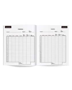 Libro para registro de jornada de empleados. Se pueden registrar hasta 10 trabajadores diferentes para el año completo. 1 mes por página. Ideal para pequeñas empresas y autónomos. Espacio para registro de horas, recuento horas totales ordinarias y extraordinarias y firma del trabajador. 120 hojas. Papel blanco de 90 g/m². Formato DIN A4.