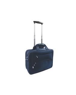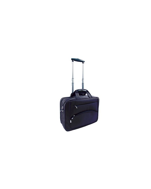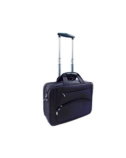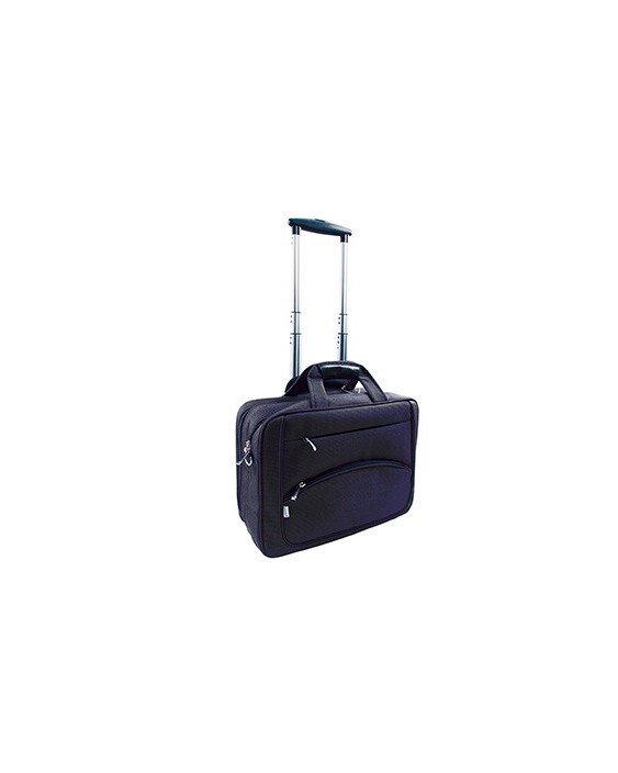 Maletín tipo trolley robusto y resistente, fabricado en poliéster. Tiene dos bolsillos exteriores con cierre de cremallera uno más grande para guardar documentos, libros, la tablet y otro más pequeño para bolígrafos, el móvil, las llaves, etc. Tiene 2 compartimentos interiores: uno con 3 divisiones para documentos, libros, etc. Y el otro compartimento con un interior acolchado con cierre de velcro para el ordenador portátil y el otro con dos bolsillos con solapa y cierre velcro para cables. Asas de mano con refuerzo en polipiel y velcro para unirlas. Bolsillo posterior con cierre de cremallera para esconder el asa telescópica del trolley. Color negro. Medidas: 410 x 325 x 150 mm.
