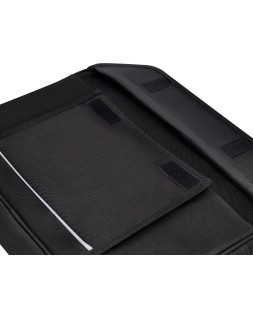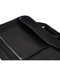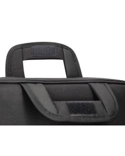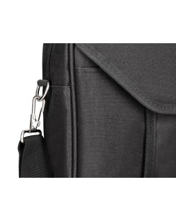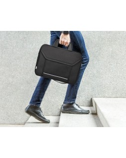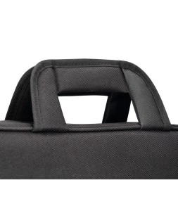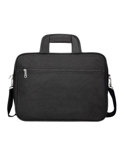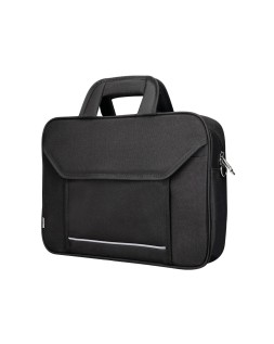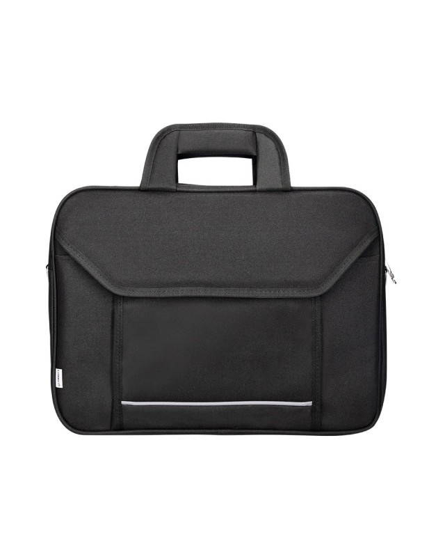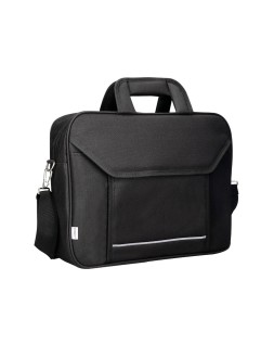Maletín para portátil práctico y ligero fabricado en poliéster. Tiene dos bolsillos exteriores, uno delantero de velcro que trae incorporados departamentos para organizar accesorios como documentos, CD, bolígrafos, etc. y otro trasero con cremallera. Posee un departamento acolchado para proteger al ordenador contra golpes con un bolsillo para los cables de electricidad. Asa de mano con velcro y de hombro. Color negro. Medidas: 390 x 290 x 90 mm.