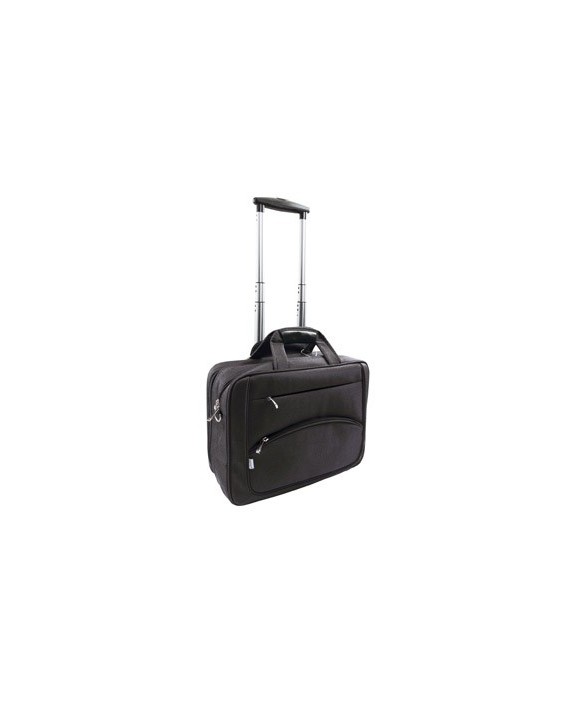 Maletín tipo trolley robusto y resistente, fabricado en poliéster. Tiene dos bolsillos exteriores con cierre de cremallera uno más grande para guardar documentos, libros, la tablet y otro más pequeño para bolígrafos, el móvil, las llaves, etc. Tiene 2 compartimentos interiores: uno con 3 divisiones para documentos, libros, etc. Y el otro compartimento con un interior acolchado con cierre de velcro para el ordenador portátil y el otro con dos bolsillos con solapa y cierre velcro para cables. Asas de mano con refuerzo en polipiel y velcro para unirlas. Bolsillo posterior con cierre de cremallera para esconder el asa telescópica del trolley. Color negro. Medidas: 410 x 325 x 150 mm.