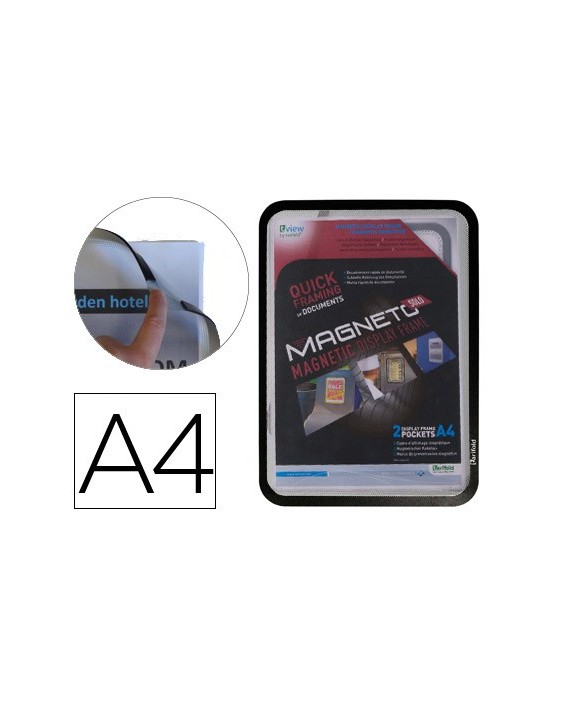 Práctico sistema imantado, rápido intercambio de documentos. Fabricado en PVC 300 micras y 4 bandas magnéticas en el dorso para su adherencia en cualquier superficie metálica. Uso: portaprecios, instrucciones, horarios, etc. Formato DIN A4. El pack de 2 marcos.