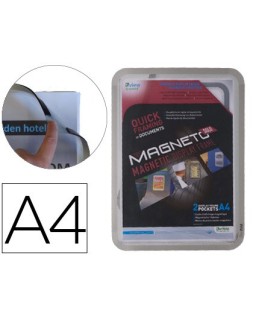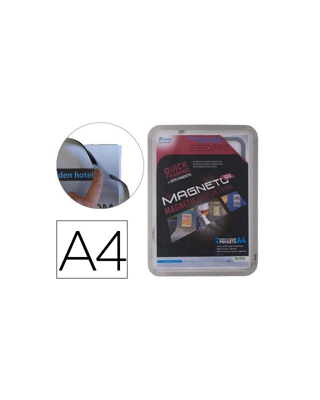 Práctico sistema imantado, rápido intercambio de documentos. Fabricado en PVC 300 micras y 4 bandas magnéticas en el dorso para su adherencia en cualquier superficie metálica. Uso: portaprecios, instrucciones, horarios, etc. Formato DIN A4. El pack de 2 marcos.