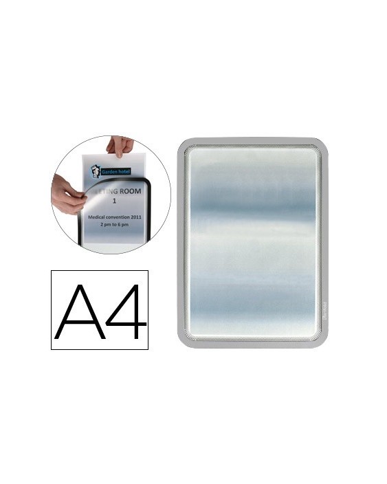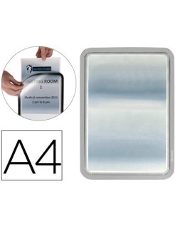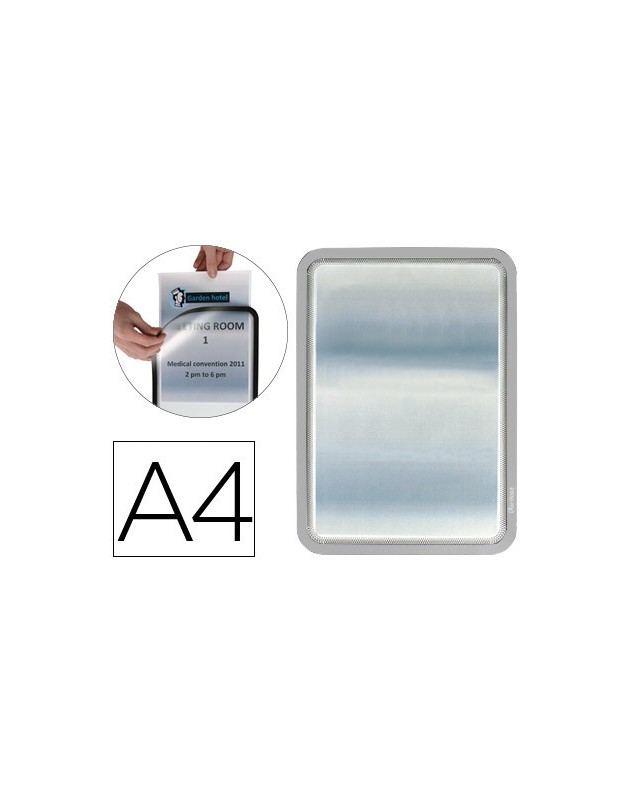 Práctico marco de señalización adhesivo para carteles, información y anuncios. Lectura a ambas caras del documento. Rápido sistema de apertura y cierre mediante imanes para un rápido intercambio de los documentos. Dorso adhesivo removible y reposicionable, se adhiere sobre cualquier tipo de superficie lisa. Fabricado en PVC, gran resistencia. Uso: información, comunicados, portaprecios, instrucciones, menús, horarios, etc. Formato DIN A4. El pack de 2 marcos.