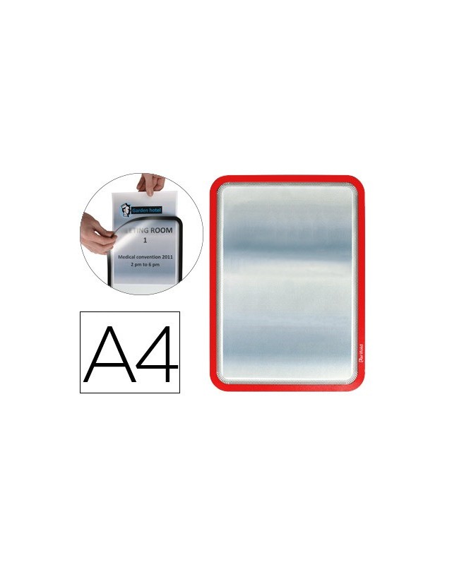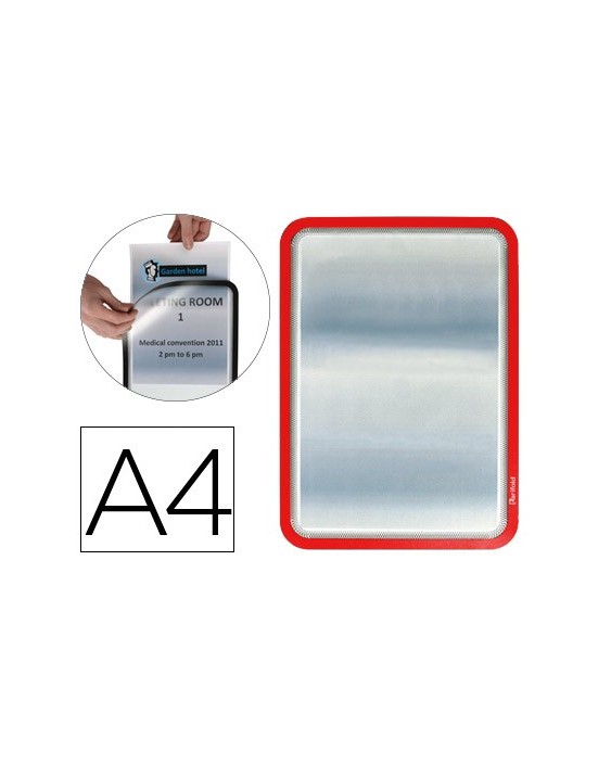 Práctico marco de señalización adhesivo para carteles, información y anuncios. Lectura a ambas caras del documento. Rápido sistema de apertura y cierre mediante imanes para un rápido intercambio de los documentos. Dorso adhesivo removible y reposicionable, se adhiere sobre cualquier tipo de superficie lisa. Fabricado en PVC, gran resistencia. Uso: información, comunicados, portaprecios, instrucciones, menús, horarios, etc. Formato DIN A4. El pack de 2 marcos.