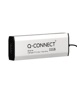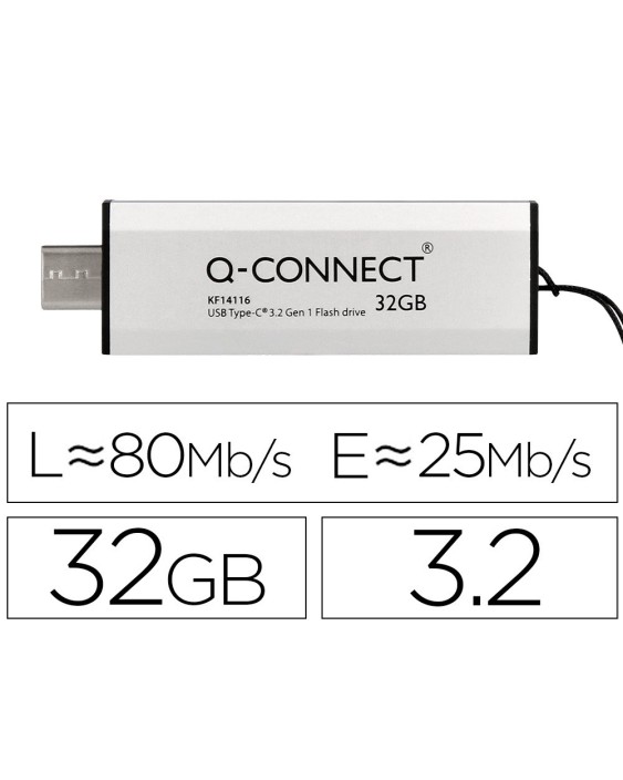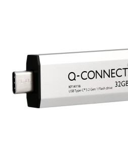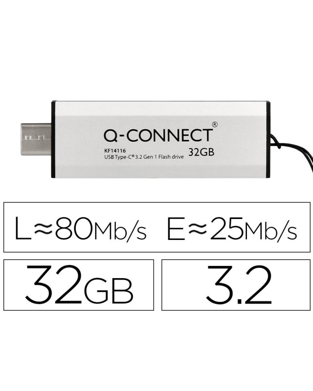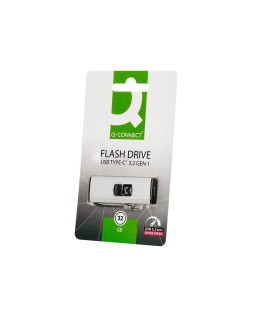 La memoria Q-Connect USB flash drive de 32GB con conexión USB 3.2 Gen 1 tipo C. Ofrece velocidades de lectura de hasta 80MB/seg y de escritura de hasta 25MB/seg. Compatible con Windows y Mac, este dispositivo cuenta con uncuerpo deslizante que protege el conector cuando no está en uso. Su diseñ o plateado y la compatibilidad con versiones anteriores de USB 2.0 lo hacen versátil y práctico. Además, cumple con normativas y certificaciones como CE, UKCA y WEEE.