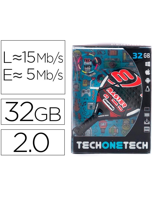 Memoria usb tech on tech raqueta padel roja 32 gb