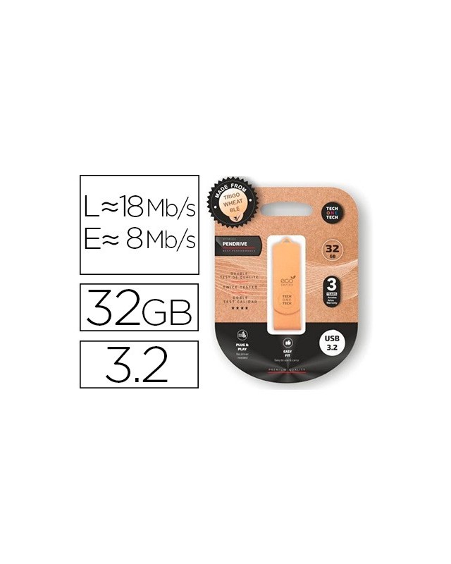 Memoria USB profesional. Biodegradable. Fabricado con paja del trigo, excepto partes electrónicas. Interface USB 2.0. Compatible con versiones anteriores de USB. Velocidad mínima de escritura 18Mb/s. Velocidad mínima de lectura garantizada: 75 Mb/s. Garantía: 3 años. Medidas del producto 17 x 60 x 10 mm. Peso 8 gramos.
