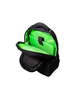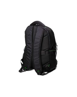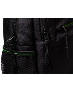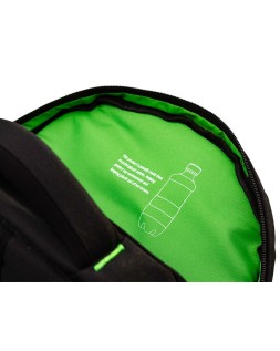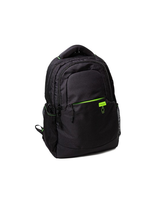Mochila para portátil, práctica y ligera fabricada RPET procedente de botellas de plástico recicladas. Tiene dos bolsillos exteriores con cierre de cremallera, para llevar a mano el teléfono móvil, las llaves, la cartera, etc. Tiene un compartimento interior acolchado para el ordenador portátil y otro para la Tablet con cierre de velcro. Bolsillos de rejilla lateralespara el agua o cables. Un asa de mano y dos asas para colgar en la espald a. Color negro. Medidas: 320 x 430 x 140 mm