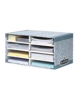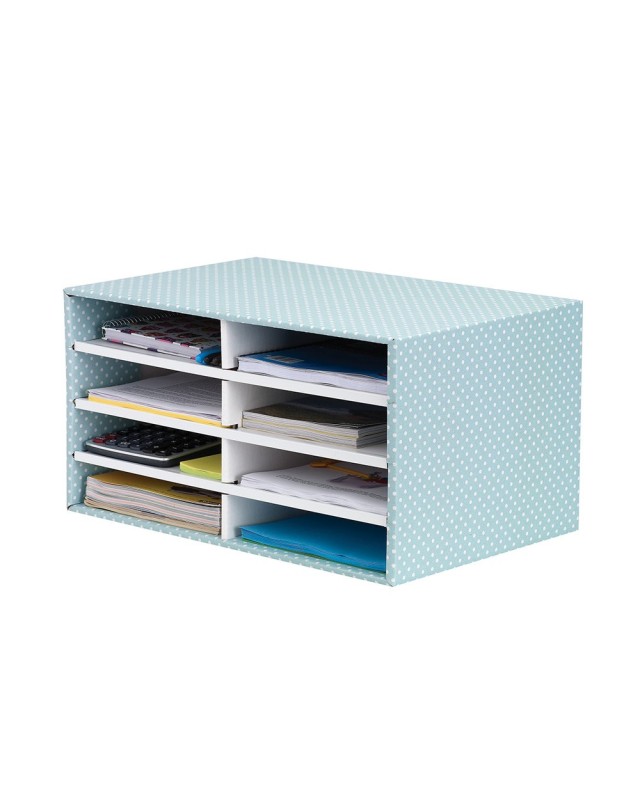 Organizador fabricado en cartón 100% reciclado e impreso con tintas a base de agua. 100% reciclable. Ocho casilleros para organizar documentos, correo y otros productos de escritorio. En la parte frontal se pueden incluir etiquetas. Apilable hasta tres alturas para ahorrar espacio. Medidas compartimento: 23 x 5,5 x 31 cm. Medidas del módulo: 49 x 26 x 31 cm. Se entrega sin montar.