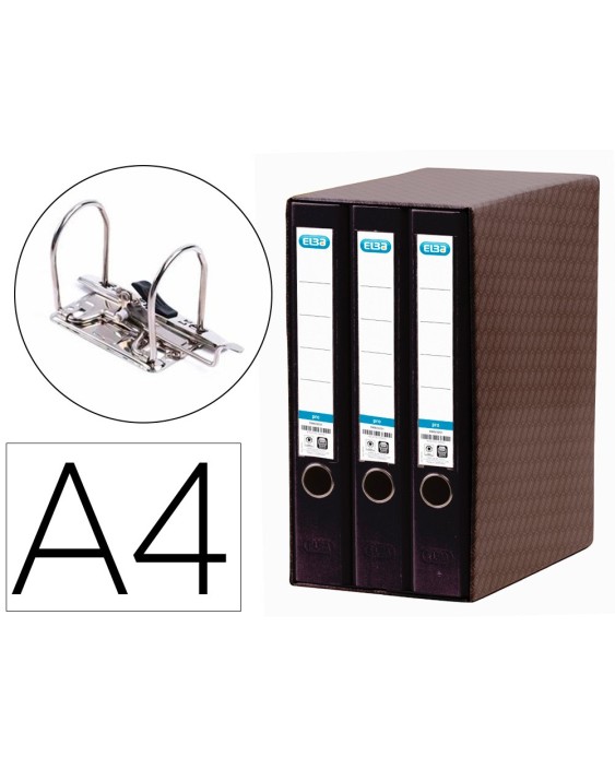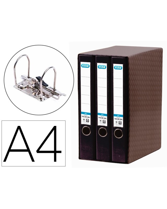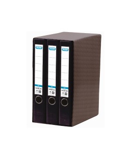 Archivador forrado y plastificado en polipropileno con tarjetero. Las cajas están fabricadas en cartón de doble microcanal, barnizado y plastificado en polipropileno brillante. Medidas exteriores del módulo: 320 mm alto x 170 mm ancho x 300 mm fondo. Ancho de lomo: 50 mm. Formato DIN A4. Mecanismo de palanca de 50 mm. Medida del archivador: 290 x 320 mm.