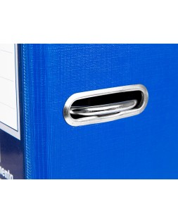 Fabricado en cartón entrecolado de 1,90 mm de espesor forrado con papel de encuadernación plastificado y gofrado con tela de PVC. Mecanismo de palanca de 75 mm con compresor metálico, cantoneras largas, ollao y tarjetero en el lomo con Rado®. Tamaño folio. Medidas exteriores del módulo: 184 mm ancho x 350 mm alto x 290 mm fondo. Ancho de lomo: 75 mm. Medidas: 280 x 345 mm.