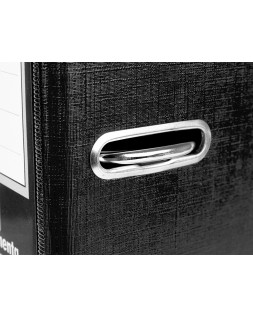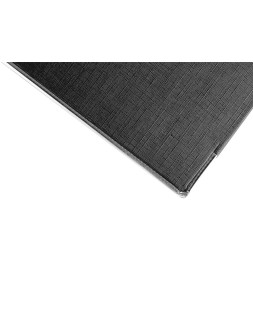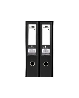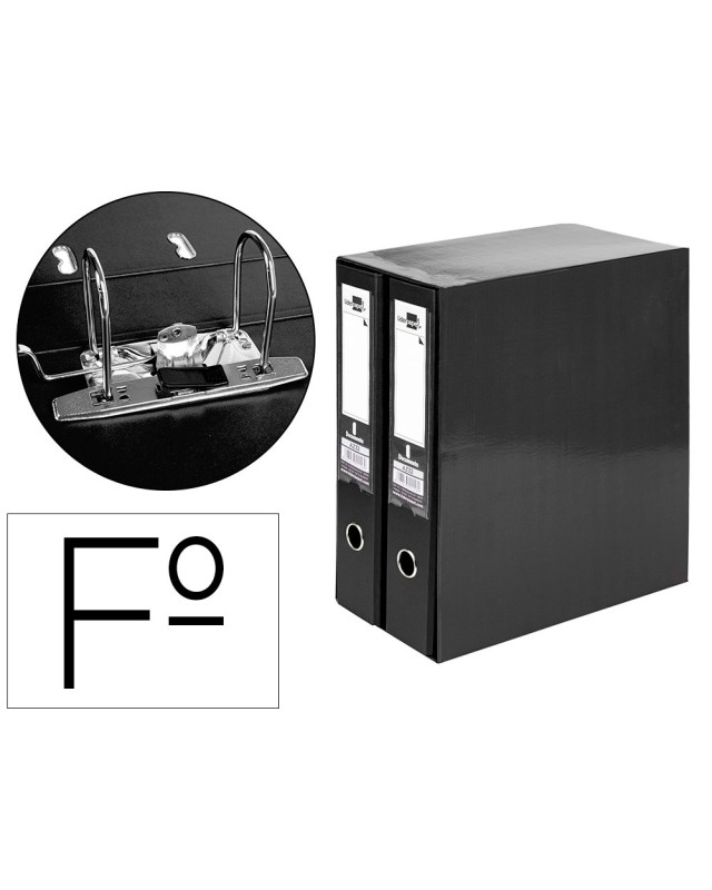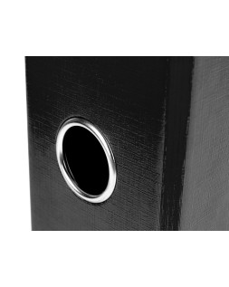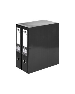 Fabricado en cartón entrecolado de 1,90 mm de espesor forrado con papel de encuadernación plastificado y gofrado con tela de PVC. Mecanismo de palanca de 75 mm con compresor metálico, cantoneras largas, ollao y tarjetero en el lomo con Rado®. Tamaño folio. Medidas exteriores del módulo: 184 mm ancho x 350 mm alto x 290 mm fondo. Ancho de lomo: 75 mm. Medidas: 280 x 345 mm.