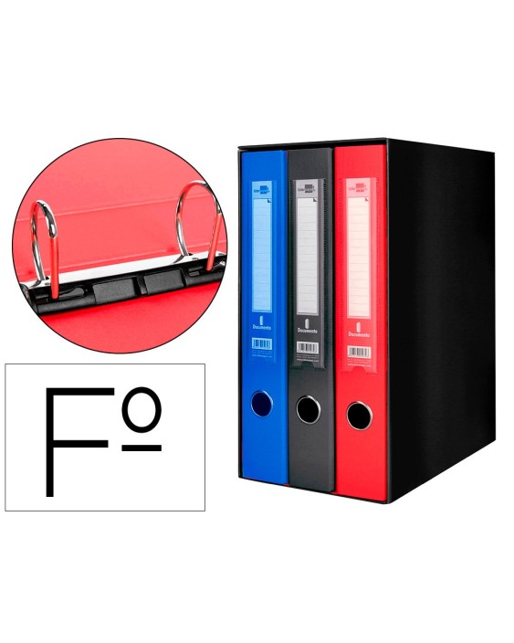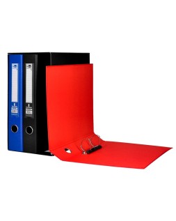 Fabricado en cartón entrecolado de 1,90 mm de espesor forrado con papel deencuadernación plastificado y gofrado con tela de PVC. 2 anillas mixtas d e 40 mm con compresor de plástico, cantoneras largas, ollao y tarjetero enel lomo. Tamaño folio. Medidas exteriores del módulo: 184 mm ancho x 350 mm alto x 290 mm fondo. Ancho de lomo: 60 mm. Colores surtidos, la forma más cómoda de tener la documentación de varios asuntos perfectamente clasificada y separada por color.