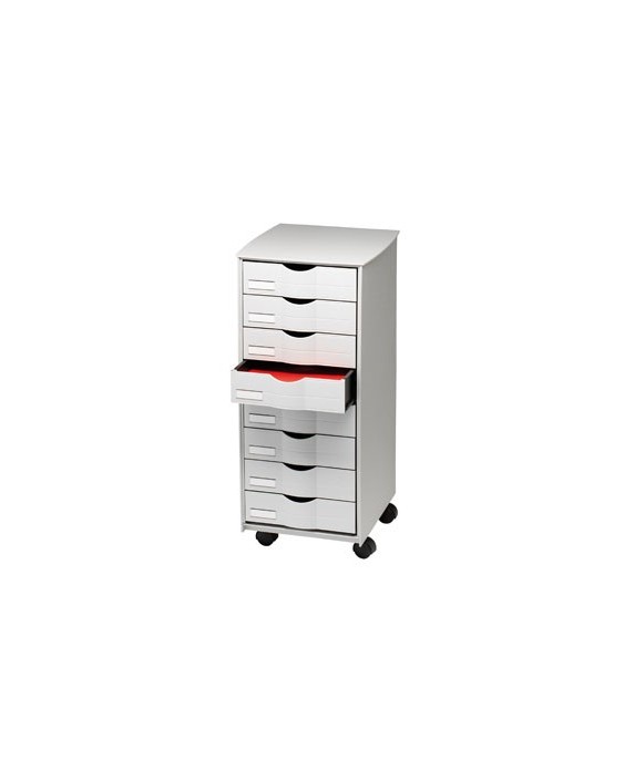Mueble móvil de cajones. Con cajones para documentos de 240 x 320 mm. Fabricado en poliestireno de alto impacto. Tope de retención en cada cajón. Con cuatro ruedas giratorias. Incluye etiquetas y portaetiquetas. Se entrega semimontado, para solo tener que clipsar las fachadas de los cajones.