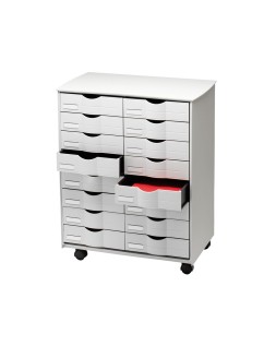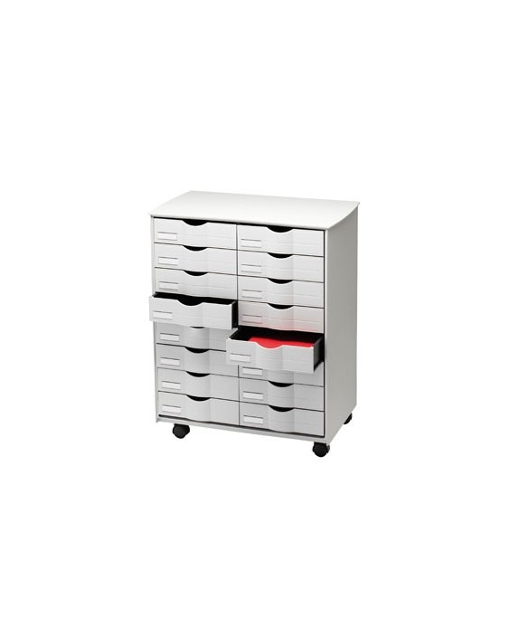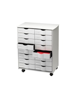 Mueble móvil de cajones. Con cajones para documentos de 240 x 320 mm. Fabricado en poliestireno de alto impacto. Tope de retención en cada cajón. Con cuatro ruedas giratorias. Incluye etiquetas y portaetiquetas. Se entrega semimontado, para solo tener que clipsar las fachadas de los cajones.