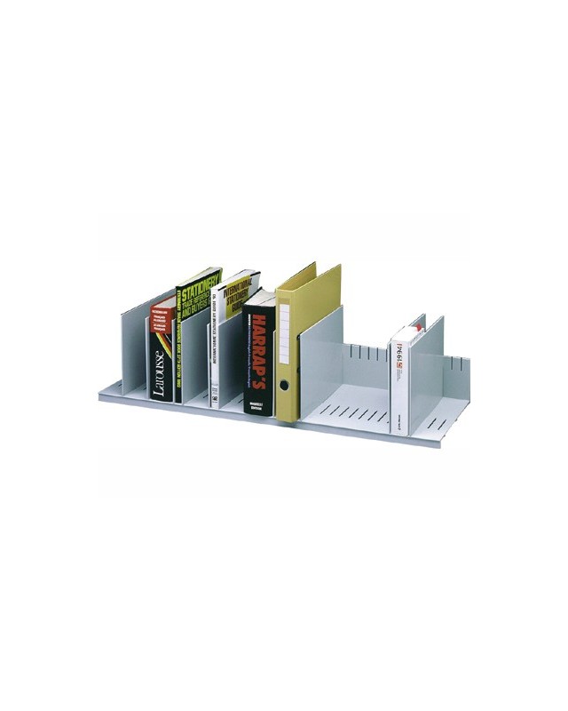 Estructura en poliestireno de alto impacto. Clasificador con separadores ajustables en color gris que se adaptan al grosor de los documentos, revistas, diccionarios, etc. 10 compartimentos. Ancho de la casilla regulable. Medidas: 80,2 x 21 x 27,5 cm.
