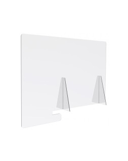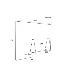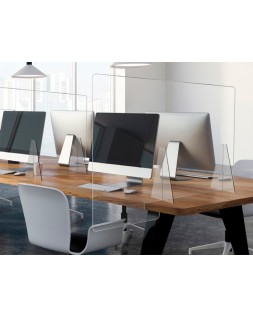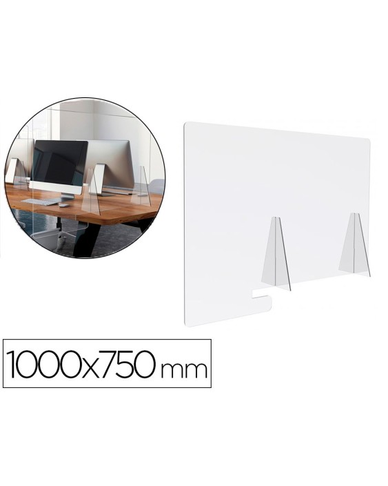 Pantalla de oficina separadora ideal para garantizar la seguridad en puestos de trabajo de telemarketing y en oficinas. Fabricada en metacrilato transparente. Dispone de ranura de seguridad antivuelco (35 mm) que encaja bajo el tablero y garantiza su estabilidad. Estructura rígida y resistente de rápida instalación. Limpiar sólo con agua y jabón. No permite el uso de lejía o alcohol. Incluye dos peanas de 20 x 29 cm y un voladizo de 10 cm. Medidas: 100 x 75 cm.
