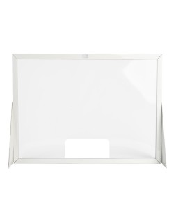 Pantalla de protección con perfil de cartón. Ligera pero estable. Ideal para el intercambio de documentos o pequeños objetos gracias a la ventana central inferior. Incluye dos peanas para una estabilidad más segura. Limpiar sólo con agua y jabón. Disponible en dos posiciones. Medidas de la ventana: 30 x 15 cm.