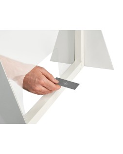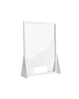 Pantalla de protección con perfil de cartón. Ligera pero estable. Ideal para el intercambio de documentos o pequeños objetos gracias a la ventana central inferior. Incluye dos peanas para una estabilidad más segura. Limpiar sólo con agua y jabón. Disponible en dos posiciones. Medidas de la ventana: 30 x 15 cm.